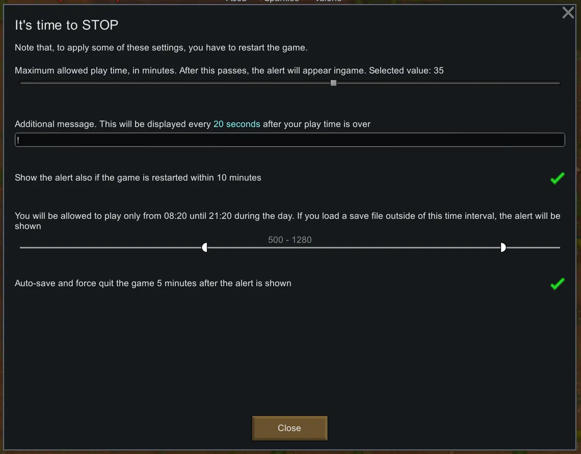 The threshold setting can only be changed by rebooting the game, so that you will not be tempted to increase it on the fly and continue playing. You can also display custom text in the recurring message.