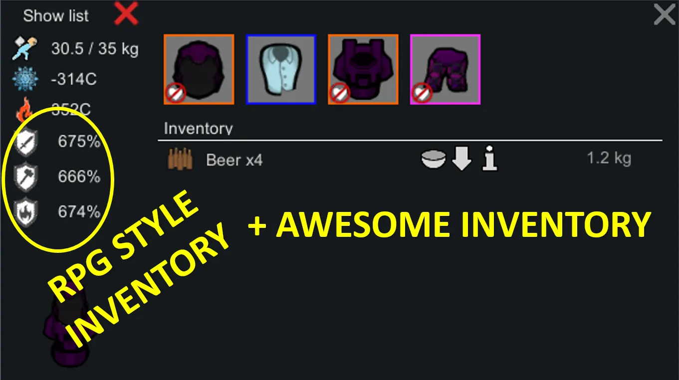 [*] Compatible with [url=https://steamcommunity.com/sharedfiles/filedetails/?id=1839305669]Wearing Armor Info[/url][b]*[/b], [url=https://steamcommunity.com/sharedfiles/filedetails/?id=1561221991]RPG Style Inventory[/url] and [url=https://steamcommunity.com/sharedfiles/filedetails/?id=2050289408]Awesome Inventory[/url].