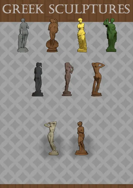 Adds nine sculptures depicting mythological characters like Aphrodite. Includes two terror statues for Ideology players. All these statues have work bills that are separate from the vanilla statues!