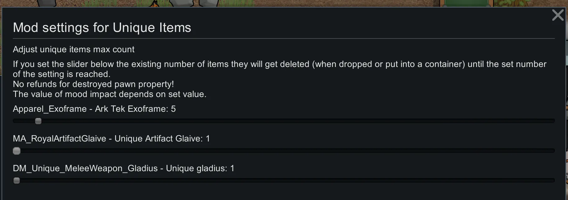 Unique & Rare enables the player to set the maximum amount of any weapon or armor in the game. If the maximum amount is reached it will prevent NPC pawns from choosing this item when gearing up for a caravan or to raid your colony.