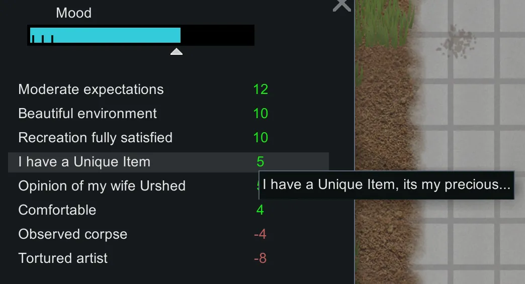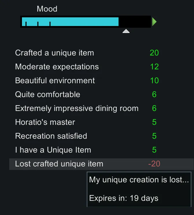 Have your crafter be proud of his work! if your pawn creates a unique or rare item he will get a mood buff.