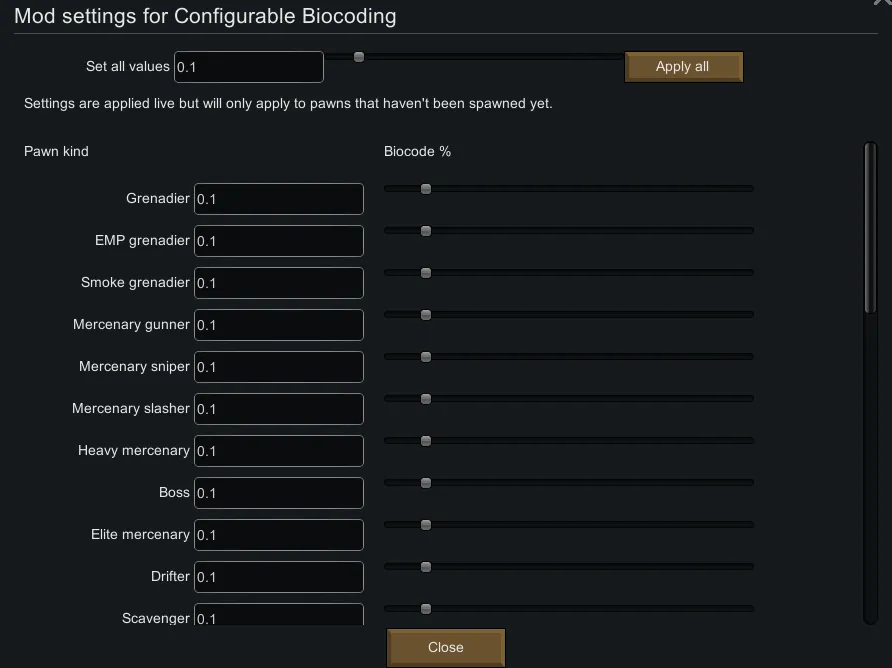 If you want to disable biocoding all together, just enter a 0% biocoding for everyone. If you prefer you can also increase difficulty using this mod by making the biocoded chance 100%, whatever you prefer.
