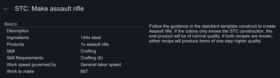 If the colony has not learned the original research, the STC recipe allows the colony to produce the item at the appropriate workbench at a set quality: poor in 1.3, normal in 1.4. With the set quality, quality enhancing inspirations are not consumed by the creation of the STC. The STC recipe will not use components or advanced components, instead using equivalent costs of base materials