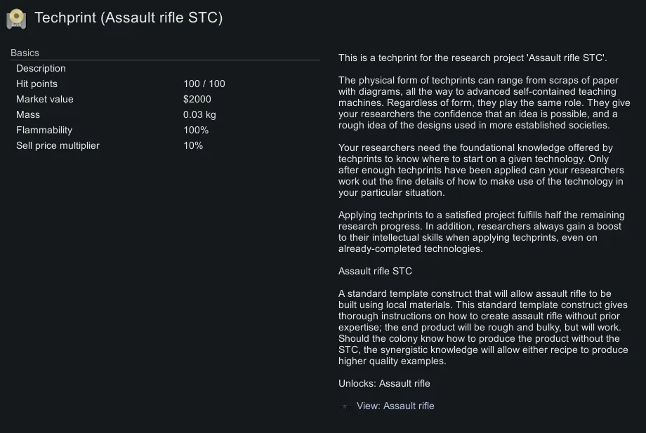 Applying it at a research bench unlocks a research item to integrate the STC into the colony's knowledge base. Once the item is researched, a recipe is unlocked for the item at the appropriate workbench.