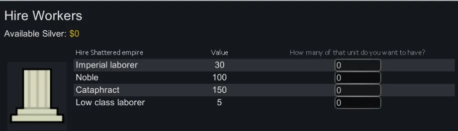 Optional Low class laborer: 5 silver a day. Cheap laborer fit for cleaning and hauling. Between 1-4 skills.