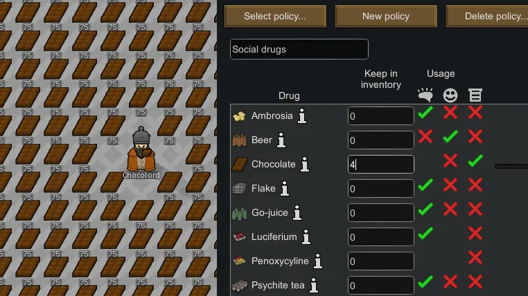 Just a small patch that adds chocolate to the drug policy menu. This means you can tell colonists to carry some chocolate on their pocket and schedule automatic chocolate consumption.