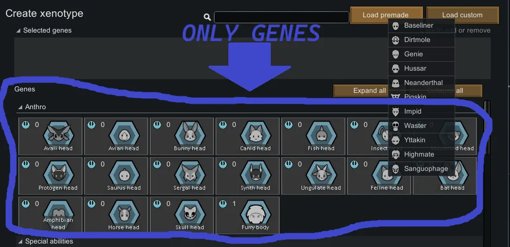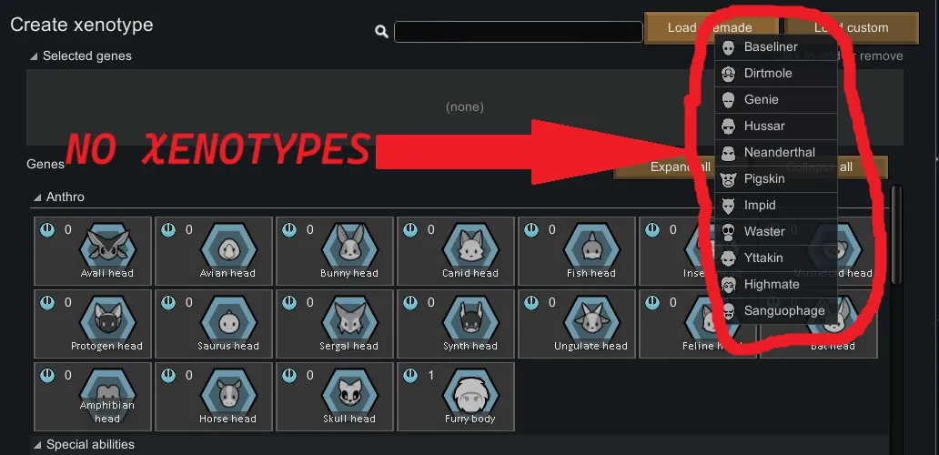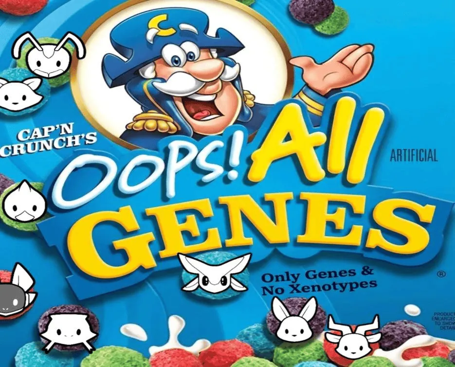 DO YOU NOT LIKE THAT Anthro genes HAS PREMADE XENOTYPES THAT COME WITH IT? Well I have good news for you, I present to you! AnthroGenes, BUT NOW WITH ONLY Genes and NO Xenotypes! Also fixed a random problem where the bug heads would show feline heads. Credits go to Stoat and Triangular for making the AnthroGenes mod, and if they have a problem with this, I will take this down for them. Random shout-out to honest_cactus for the OOPS ALL meme template and arena AI for the image edit of it, and to Fabop for pointing out the issue with the bug heads in the comments section!