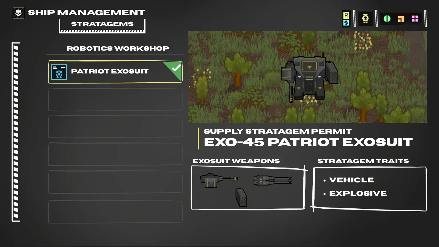 This mod adds the Exo-45 Patriot Exosuit from Helldivers 2 to Rimworld, a supreme exosuit that can be equipped with an autocannon, a minigun and a rocket launcher for maximum destruction capacity.