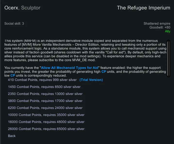 A lightweight mod that allows you to purchase mechanoid military aid directly from allied factions using Silver, while introducing a comprehensive Mechanoid Encyclopedia.