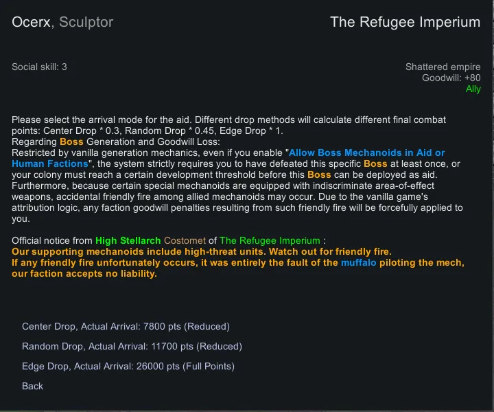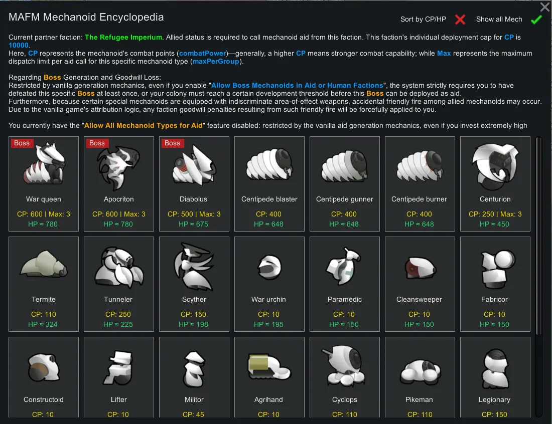 A: Specific underlying logic has been implemented to heavily mitigate this risk. When the [i]"Allow All Mechanoid Types for Aid"[/i] function is enabled, the system adjusts the generation weights: higher invested points will significantly increase the probability of deploying high-value elite units. This dynamic "quality over quantity" approach is designed to deliver devastating firepower while alleviating unnecessary strain on the CPU.