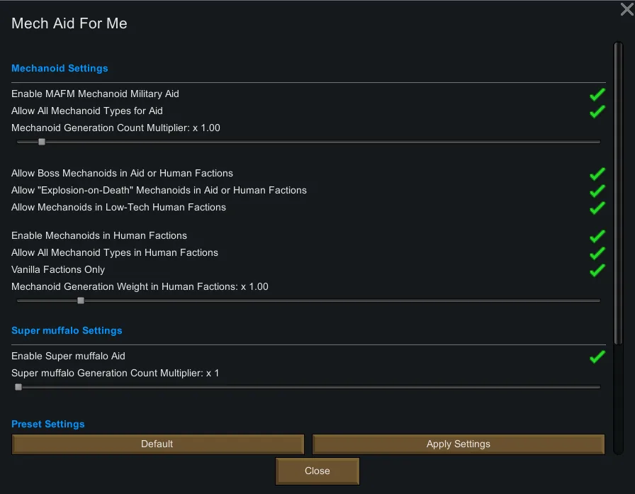 A: No problem! MAFM is completely modular. You can disable the mech aid feature and the muffalo jokes in the settings, using it strictly as a standalone Mechanoid Encyclopedia to audit your loaded mods.