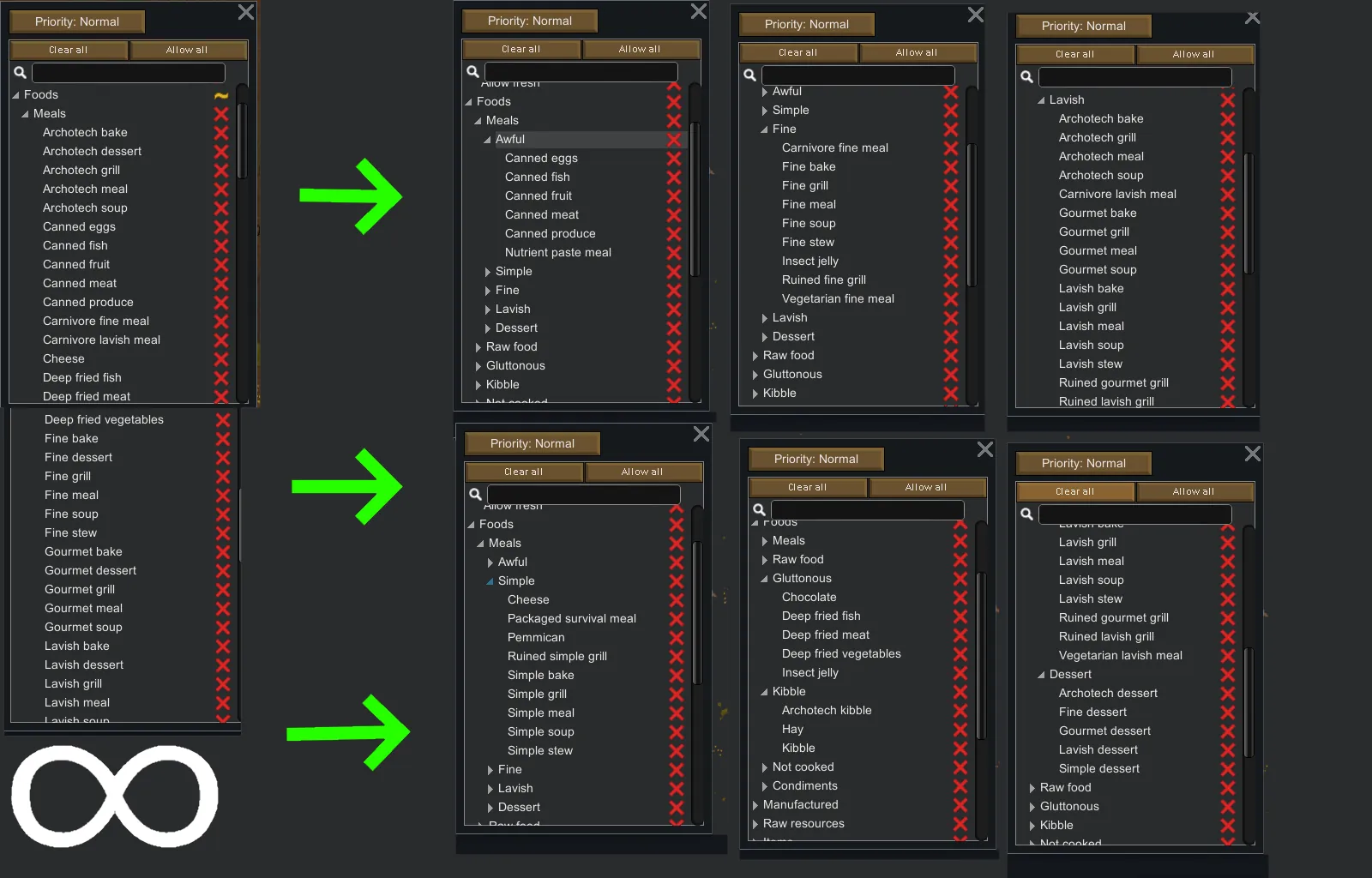 This mod adds additional categories to the food filters. It based on [url=https://steamcommunity.com/sharedfiles/filedetails/?id=2630401087]https://steamcommunity.com/sharedfiles/filedetails/?id=2630401087[/url], which duplicates food, and this annoyed me.