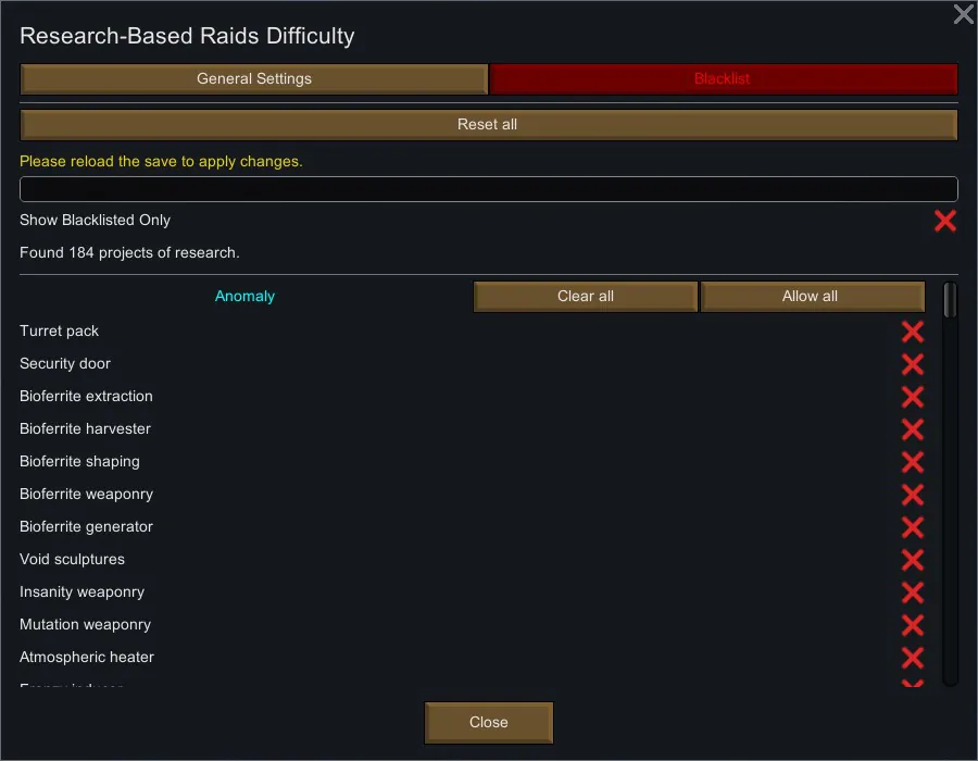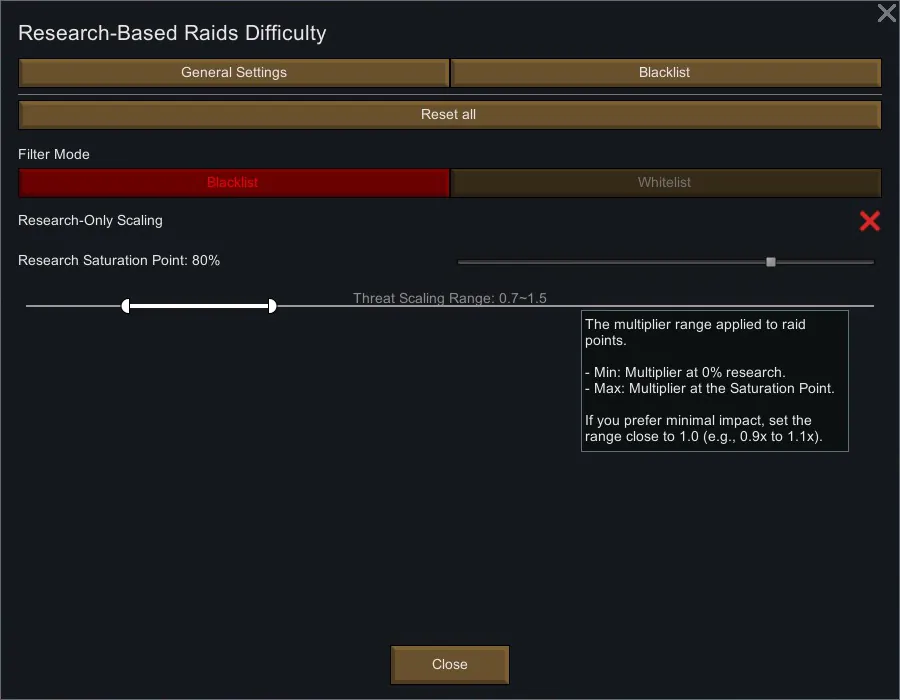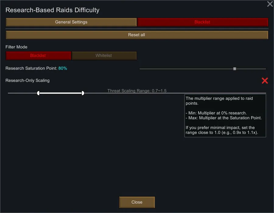 Take total control over what drives your threat score. Use Blacklist mode to exclude specific techs from your difficulty calculation, or Whitelist mode to count only the projects you choose.