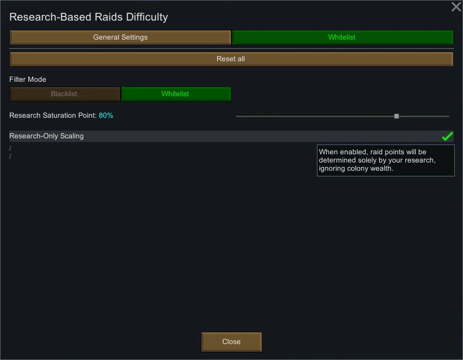 You can toggle the mode to calculate raid points solely by research, completely ignoring colony wealth for a unique progression challenge.