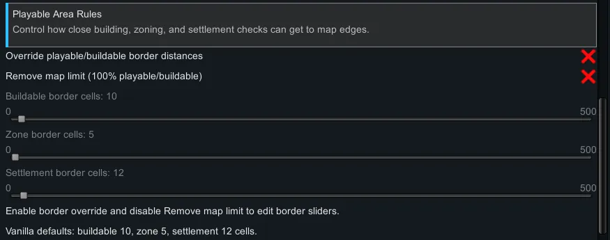 [*] Customize playable and buildable areas by adjusting border limits, with dynamic boundary visualization that updates instantly when border values change.