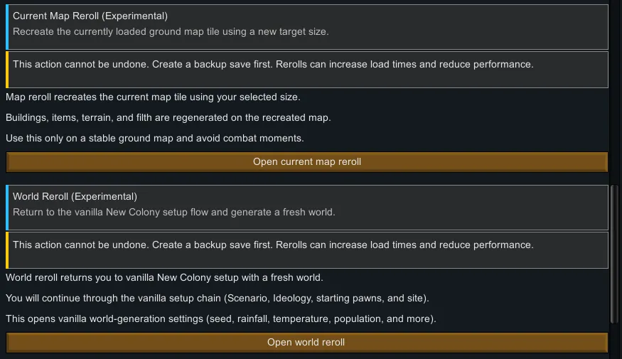 [*] Returns to the vanilla "New Colony" setup flow and generates a new world.