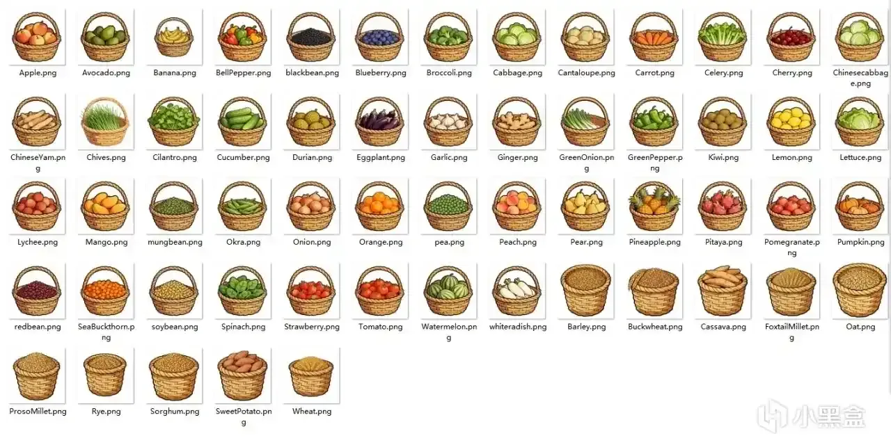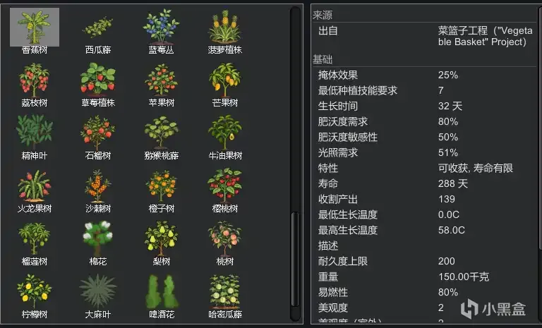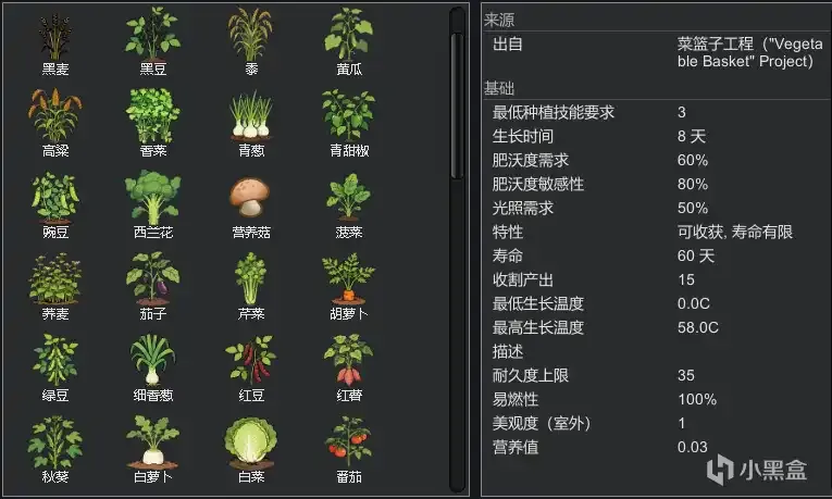 This mod adds 13 types of grains, 27 types of vegetables, 20 types of fruits, 21 types of spices, and 1 type of nut (fruits unlock with tree planting technology). The value of grains is comparable to rice; some vegetables are cash crops suitable for both making refined foods and selling for money. Fruits are high-value cash crops with high yields but slow growth rates, making them good choices for either selling or making luxury foods.