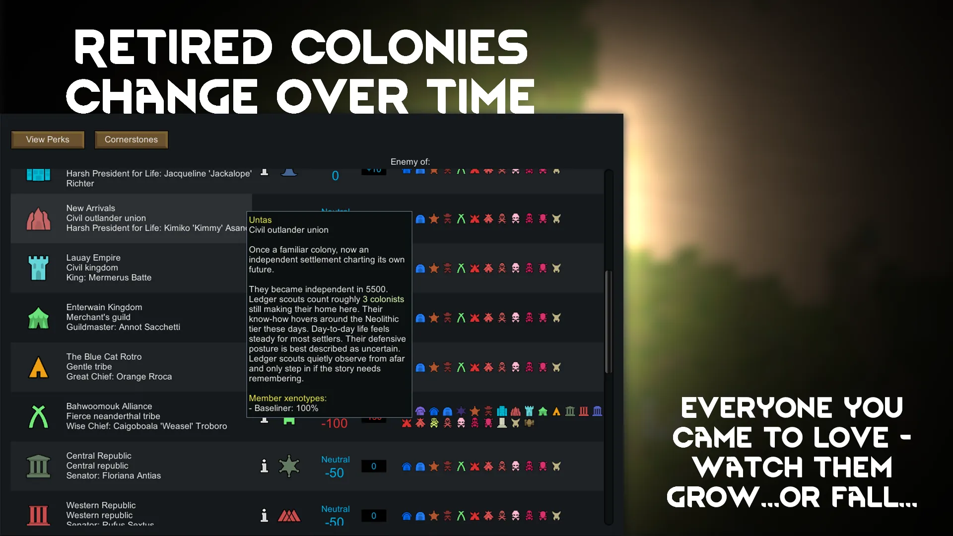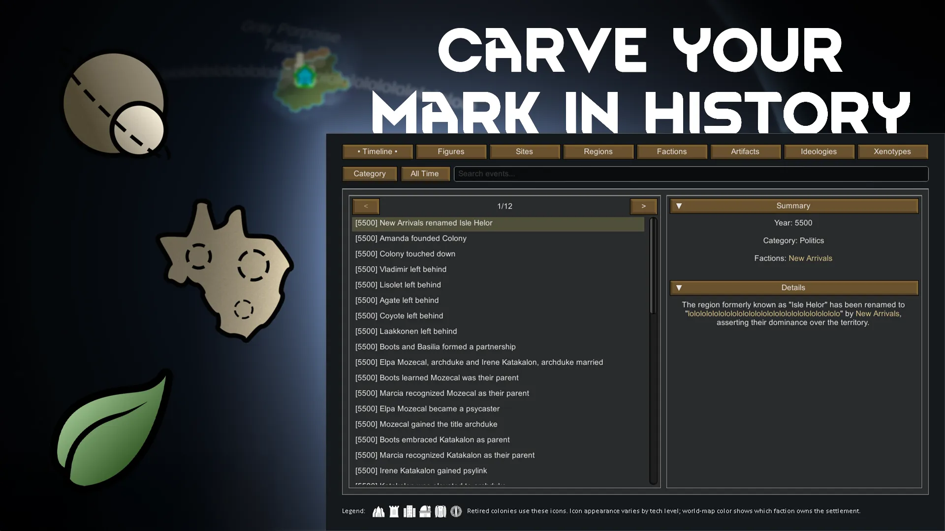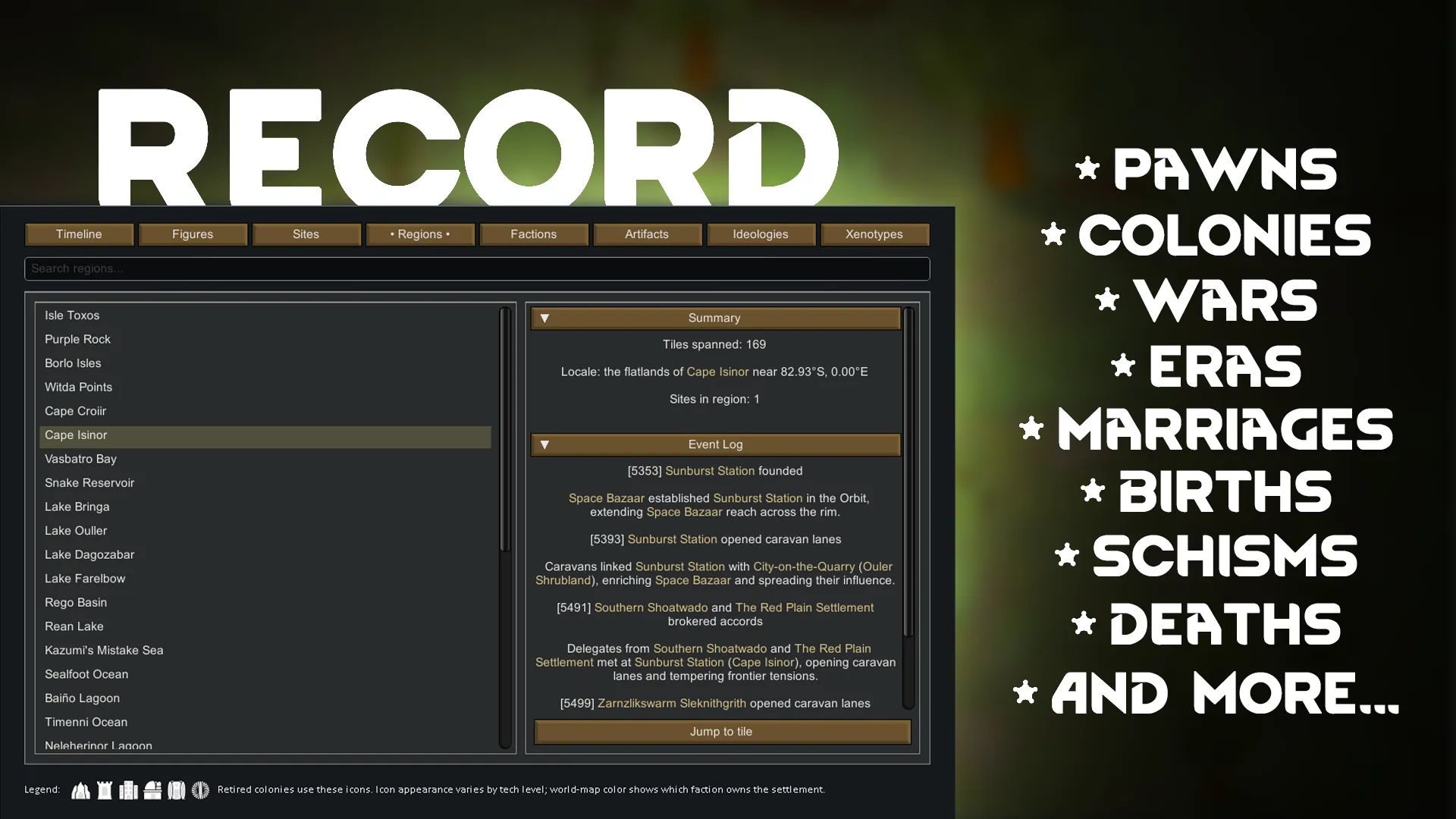 Legends Ledger generates your world with a rich, multi-era history [b]and then keeps recording events as they happen[/b]. When you’re done with a colony, retire it and re-embark as a new group [b]in the same persistent world[/b]; your old colony becomes an NPC faction, and you can still encounter your former colonists.