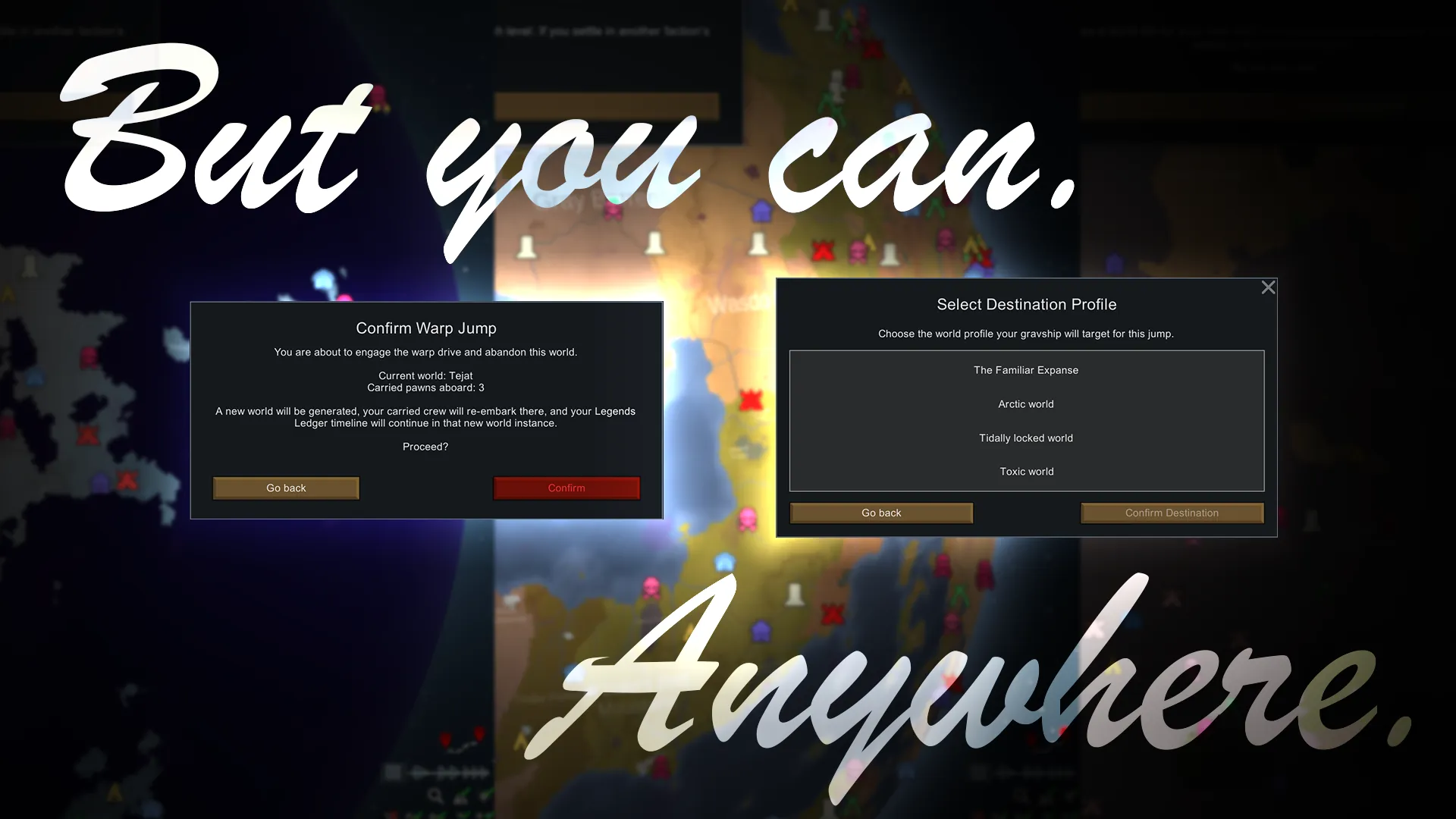 [*] Re-embark to a new World tile or space Asteroid with selectable starting tech presets.