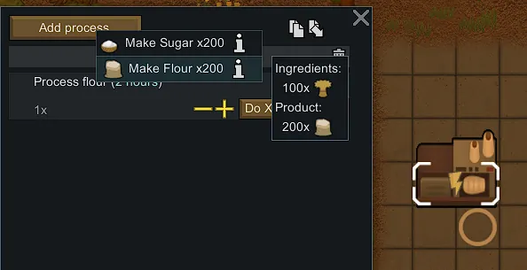 - Roller Mill: Turn 100 wheat into 200 flour and turn 100 sugar cane into 200 sugar. Both take 2 hours.