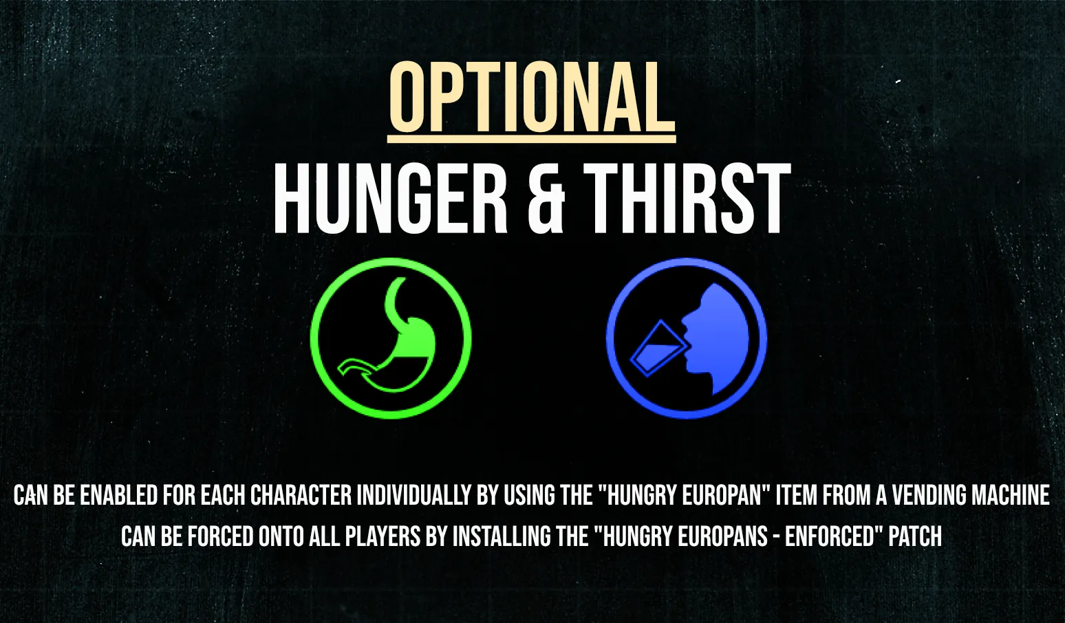 You can enable Hunger and Thirst by using an item called "Hungry Europan" found in vending machines. Your character will have to eat and drink regularly to stay alive. Hunger and Thirst CAN NOT be forced onto other players! You can only apply the item with the afflictions to yourself! Hunger and Thirst can't be disabled for your current character once enabled until you create a new one! - Optional NEEDS: