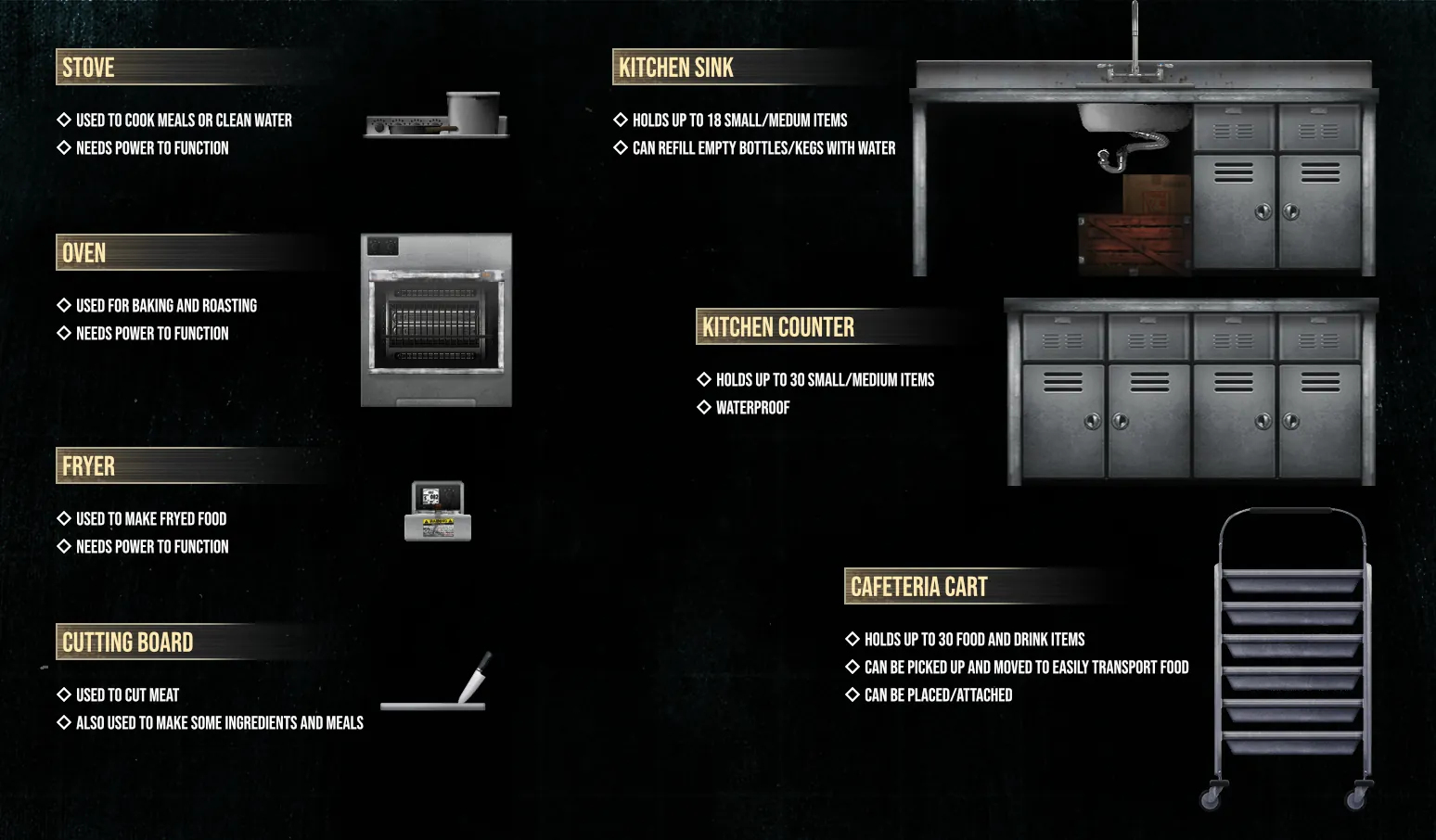 - For cooking, it is recommended to have the following items installed on your submarine: Kitchen Counter, Cutting Board, Sink, Oven.