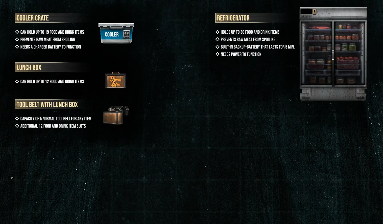 Meat products will slowly spoil if not kept within either a refrigerator, or a battery-powered cooler crate. - Alcohol Rework: