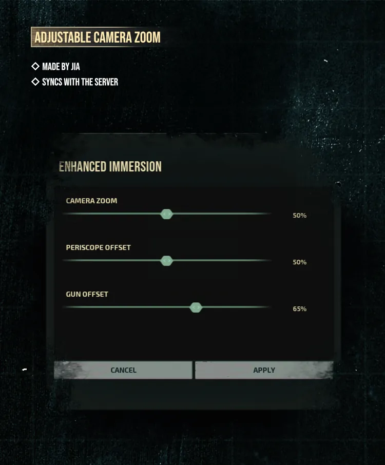 Your camera will be zoomed in much further to make you feel more connected with the game world and allow you to see all the details on and around your character. Aiming with a weapon will allow you to zoom out so you're not restrained in combat. Periscope only feature a tiny increase in view distance compared to vanilla. Improve it further by buying periscope upgrades.