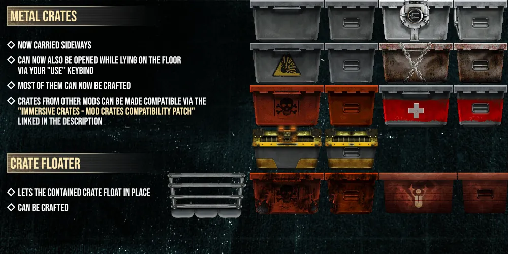 Previously this mod included some crates from other mods, however these have now been moved into Immersive Crates - Mod Crates Compatibility Patch to not clutter up the fabrication recipes for users that don't play with any of these mods the crates are from.