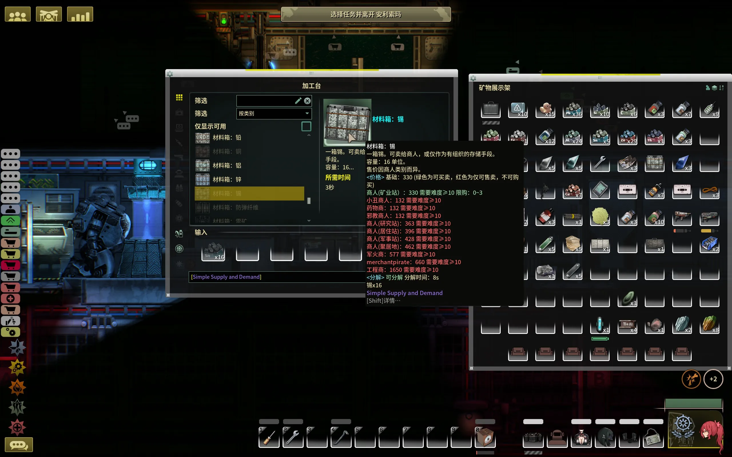 本模组为游戏添加了材料箱和医疗箱(贴图源自 EK 模组)。这些箱子可以通过制造获得,或在特定类型的前哨站购买,然后转售给其他类型的前哨站以赚取差价(或承受亏损)。