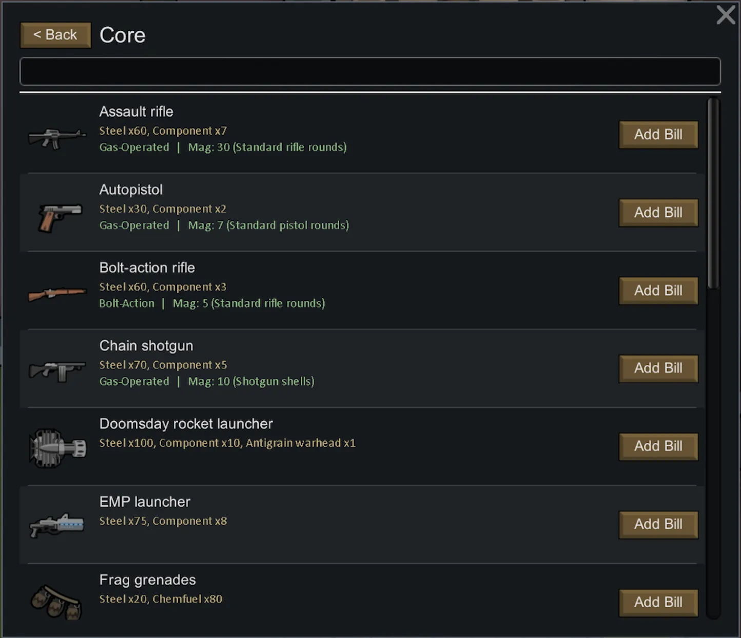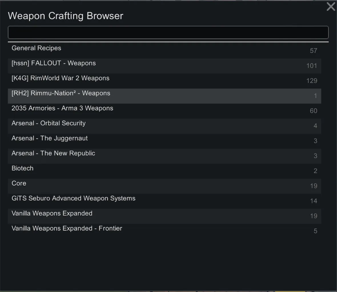 - Improved bills menu for crafting tasks at weapon production stations. Filter by mod and search for weapon types.