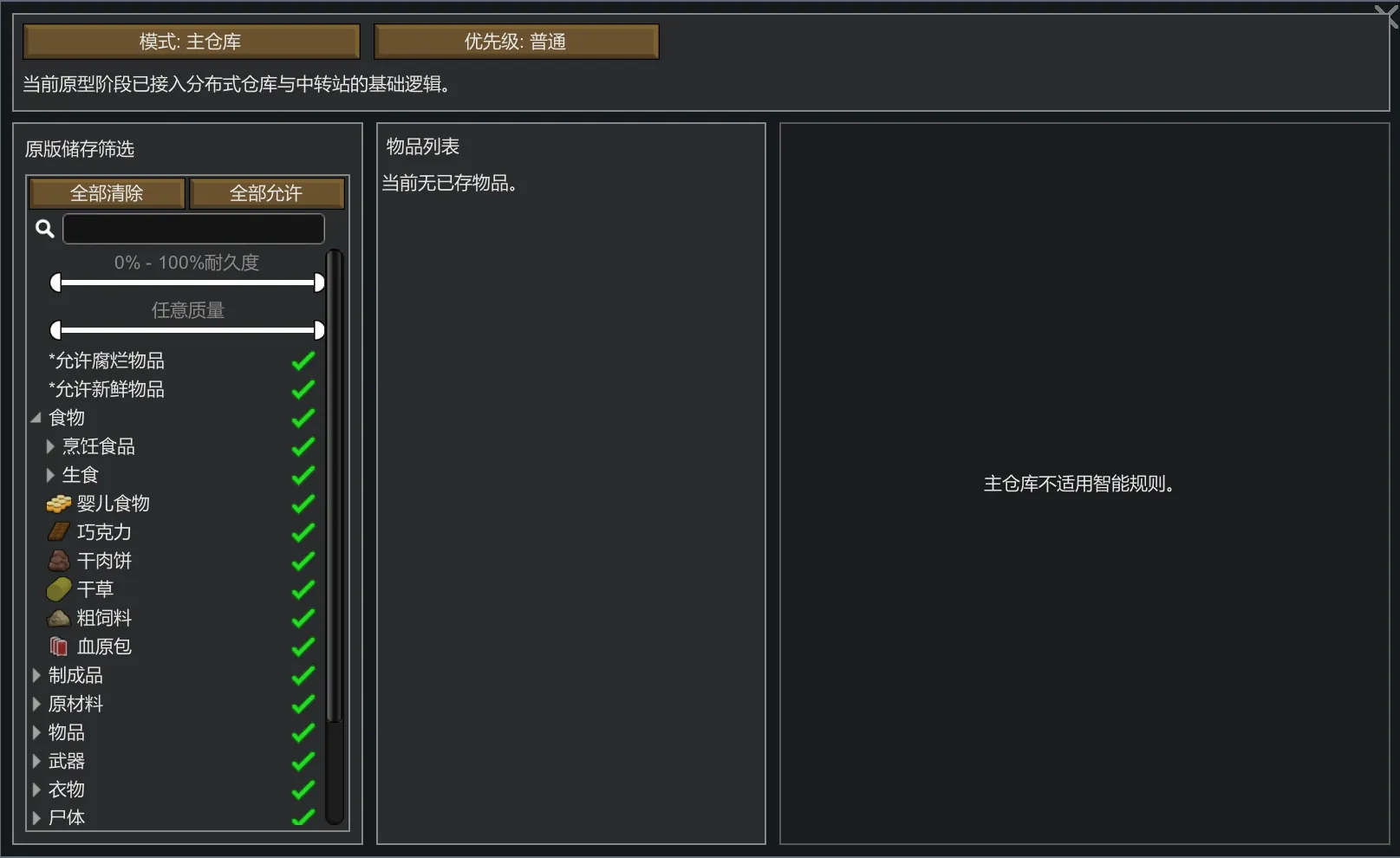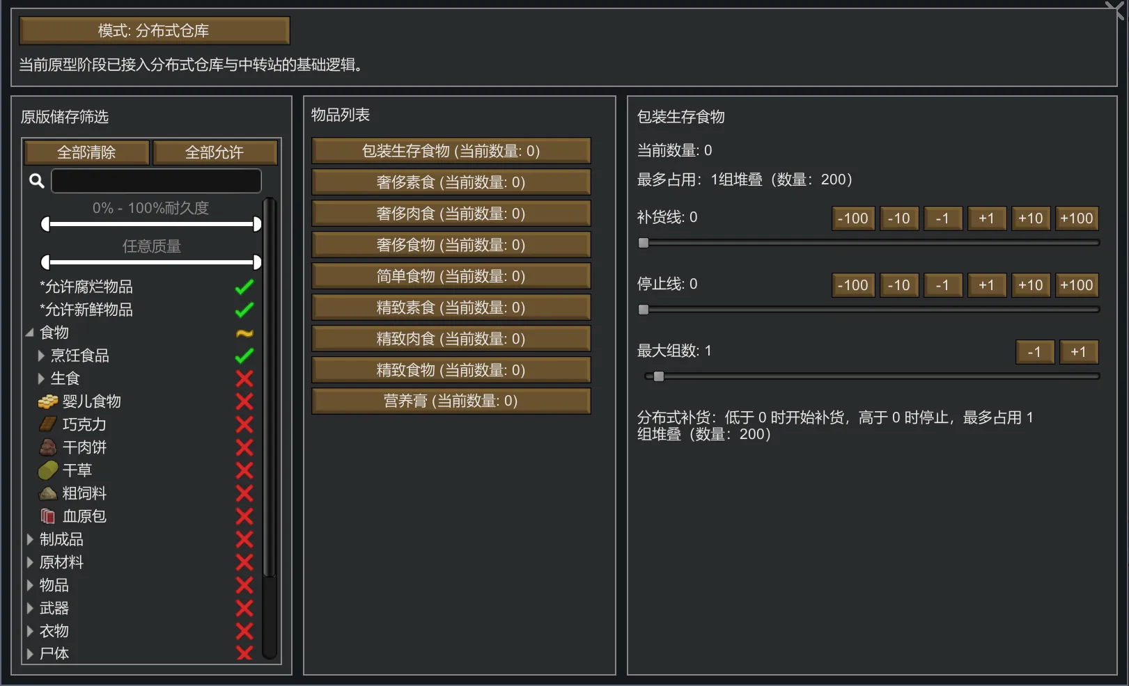It implements a hierarchical storage network consisting of a Main Warehouse, Distributed Warehouses, and Production Transfer Stations. You can build transfer stations next to workbenches to reduce the issue where crafters have to travel to the warehouse twice per finished product (once for materials, once for delivery). You can also place Distributed Warehouses on the outer parts of your base to solve the problem where hauling time becomes longer than construction time during base expansion.
