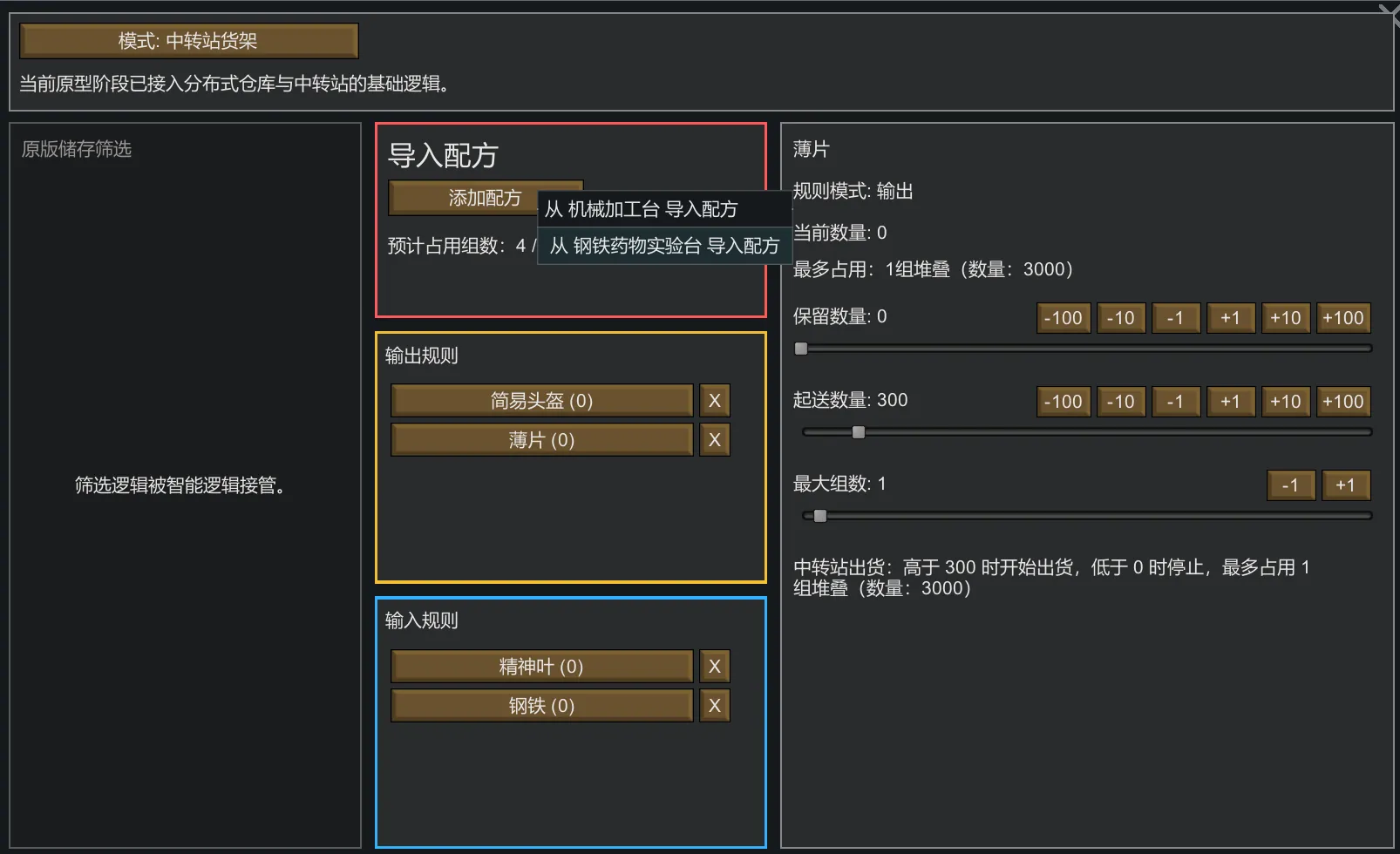 The original Smart Shelves only feature standalone transfer station shelves, but they have the advantage of simple logic and high stability. However, in late-game with a very large base, haulers may still take long trips, wander off or idle midway, forcing crafters to fetch materials and deliver goods themselves, which slows down production.