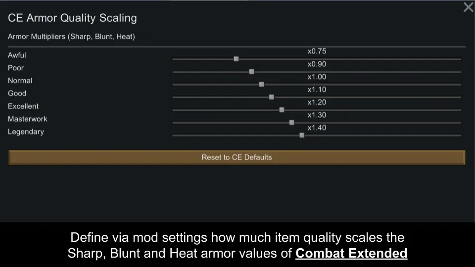 This mod allows you to modify how much the item quality affects the Sharp, Blunt and Heat armor values of items used when playing with [b]Combat Extended[/b]
