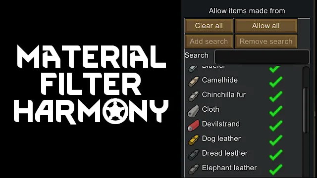 Material Filter (Harmony) is a fork of Kami Katze's Material Filter mod, rewritten to use Harmony without HugsLib plus some QoL improvements.