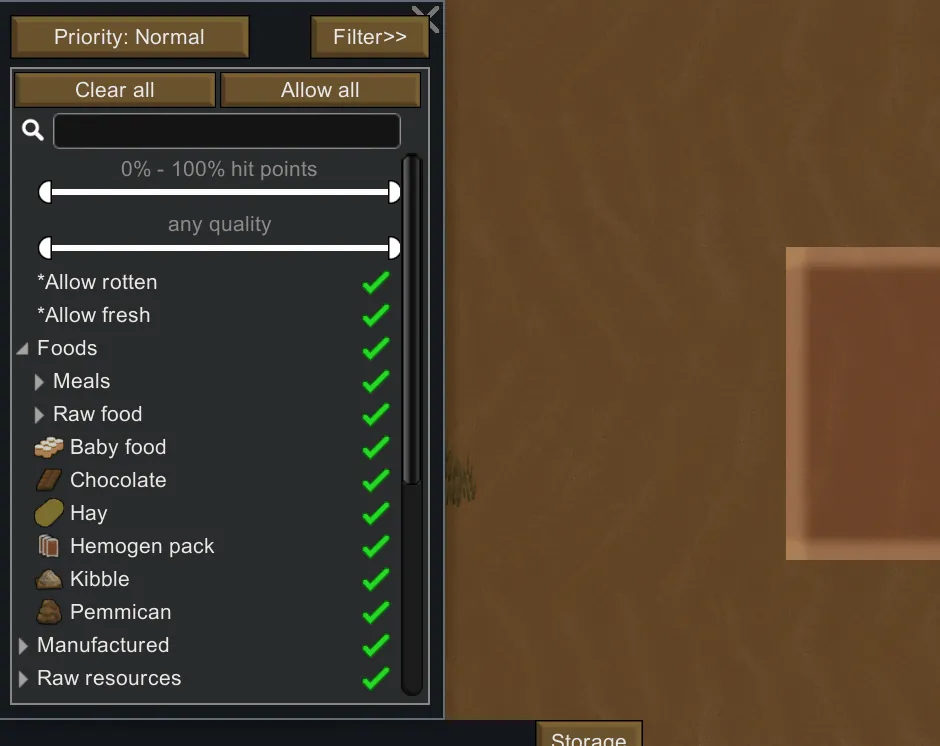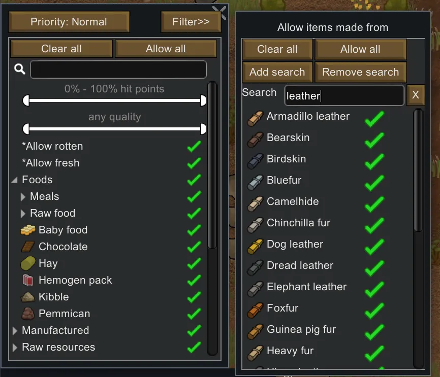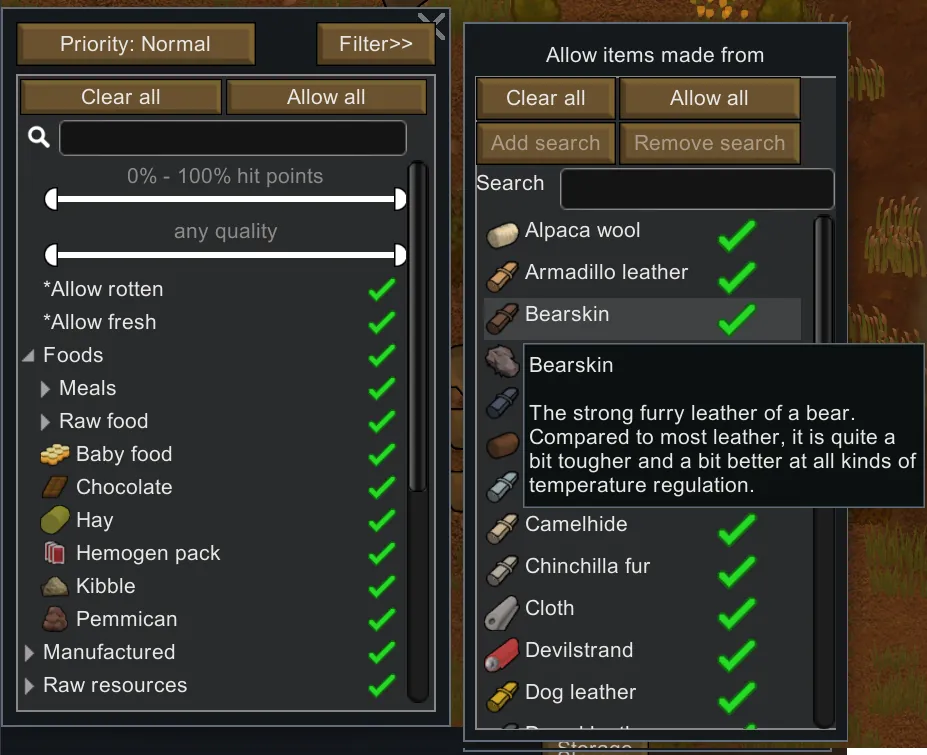 My thanks to Kami Katze's original Material Filter for many years in all my Rimworld games. Link to original mod: