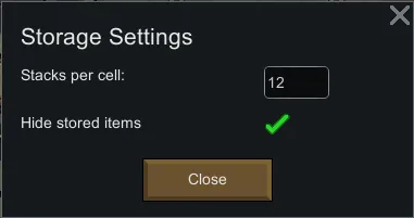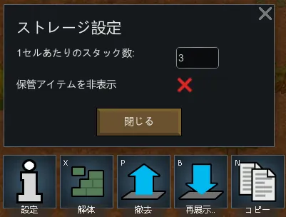 選択したストレージ(複数選択可)に以下の設定をします。 ・1セルあたりのスタック数 アイテムの保管数を入力した数字に設定します。 ・スタックされたアイテムの非表示 チェックすることで保管アイテムと個数表記を隠します。 MOD内のXMLを修正することで任意のストレージにこのギズモを追加可能 デフォルトで対応済みは以下 ・バニラ ・Medieval Overhaul ・Vanilla Factions Expanded - Medieval 2