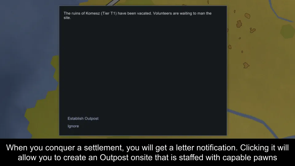 [*] The outpost will be staffed with capable pawns. The number of pawns depends on the Tier level of the captured settlement (T1 = 3 pawns, T2 = 7 pawns, T3 = 12 pawns)