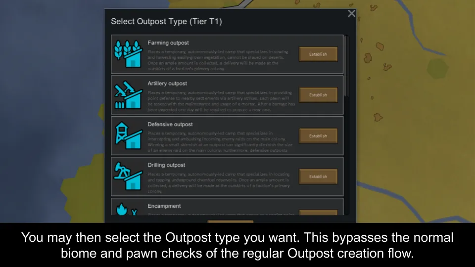 [*] Clicking it will allow you to create an Outpost onsite (from Vanilla Outposts Expanded). The biome and min pawn requirements are bypassed by that option