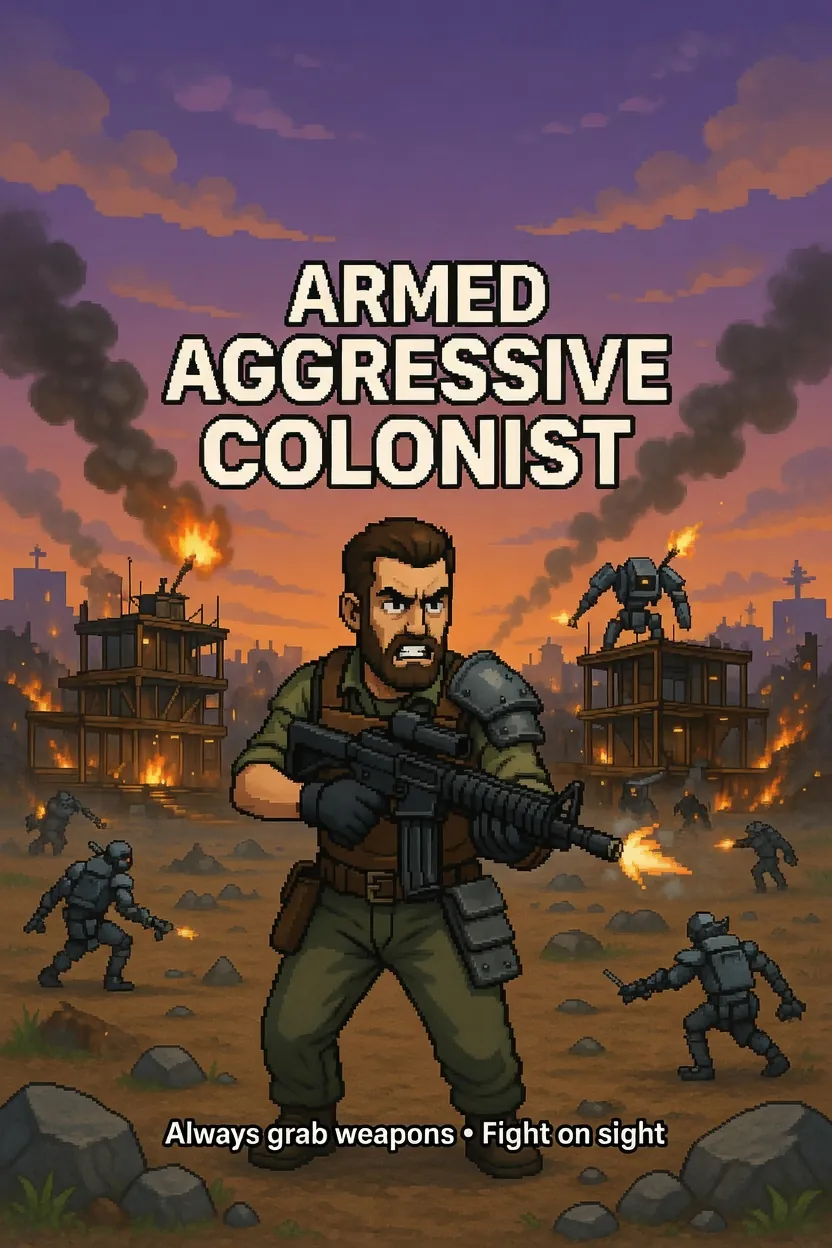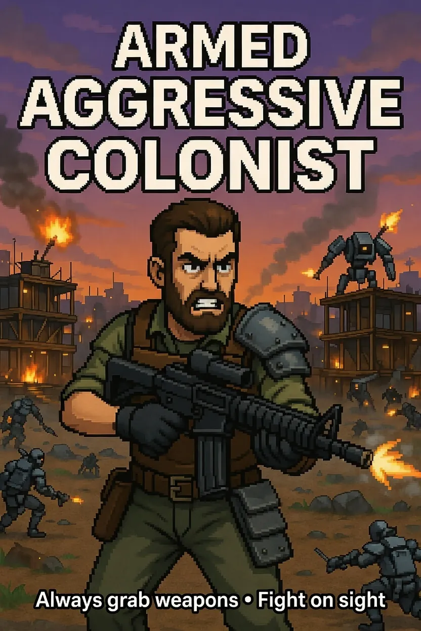 This mod adds the behavior for your colonists to always grab weapons if they're not busy with duties and switch behavior to agressive towards enemines