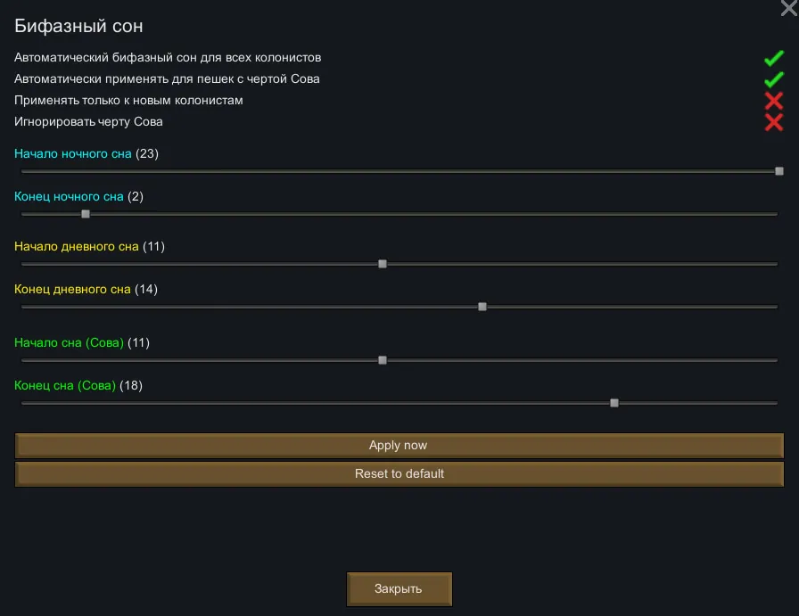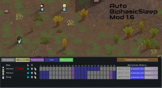 This mod automatically assigns a biphasic sleep schedule to your colonists, helping to keep their mood stable and reduce the risk of mental breaks.