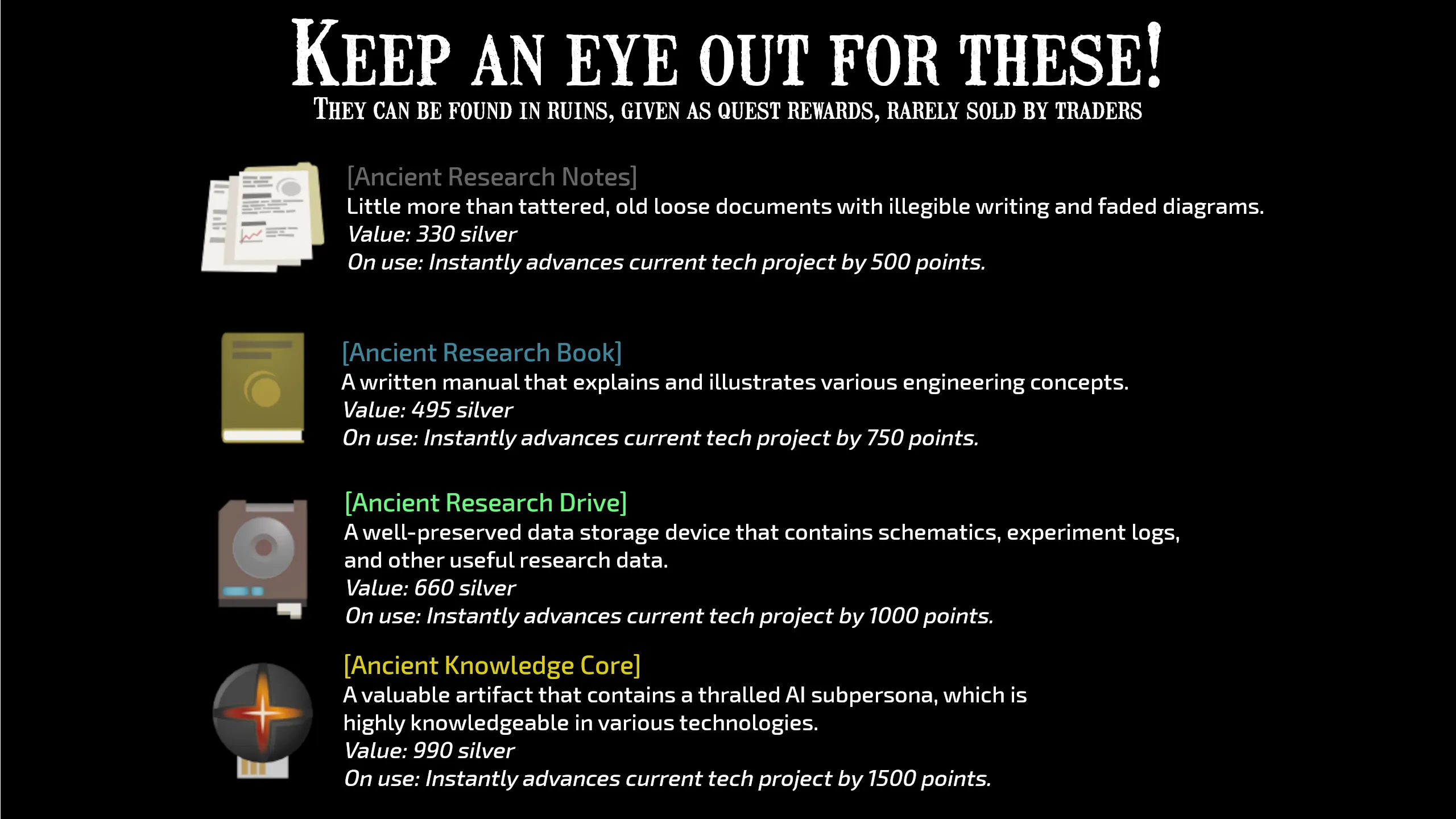 Adds four new tiered items that can be found as loot in ruins and given as quest rewards. They are single-use items that immediately advance the progress of the current research project by a number of points, similar to how a techprof subpersona core is used. They can also rarely appear on exotic goods traders. This was inspired by the research system in Kenshi.
