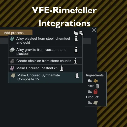 This submod integrates Diseases Overhauled and Rimefeller's recipes into VFE Factory productions chains. Also includes an optional recipe for reinforced barrels.