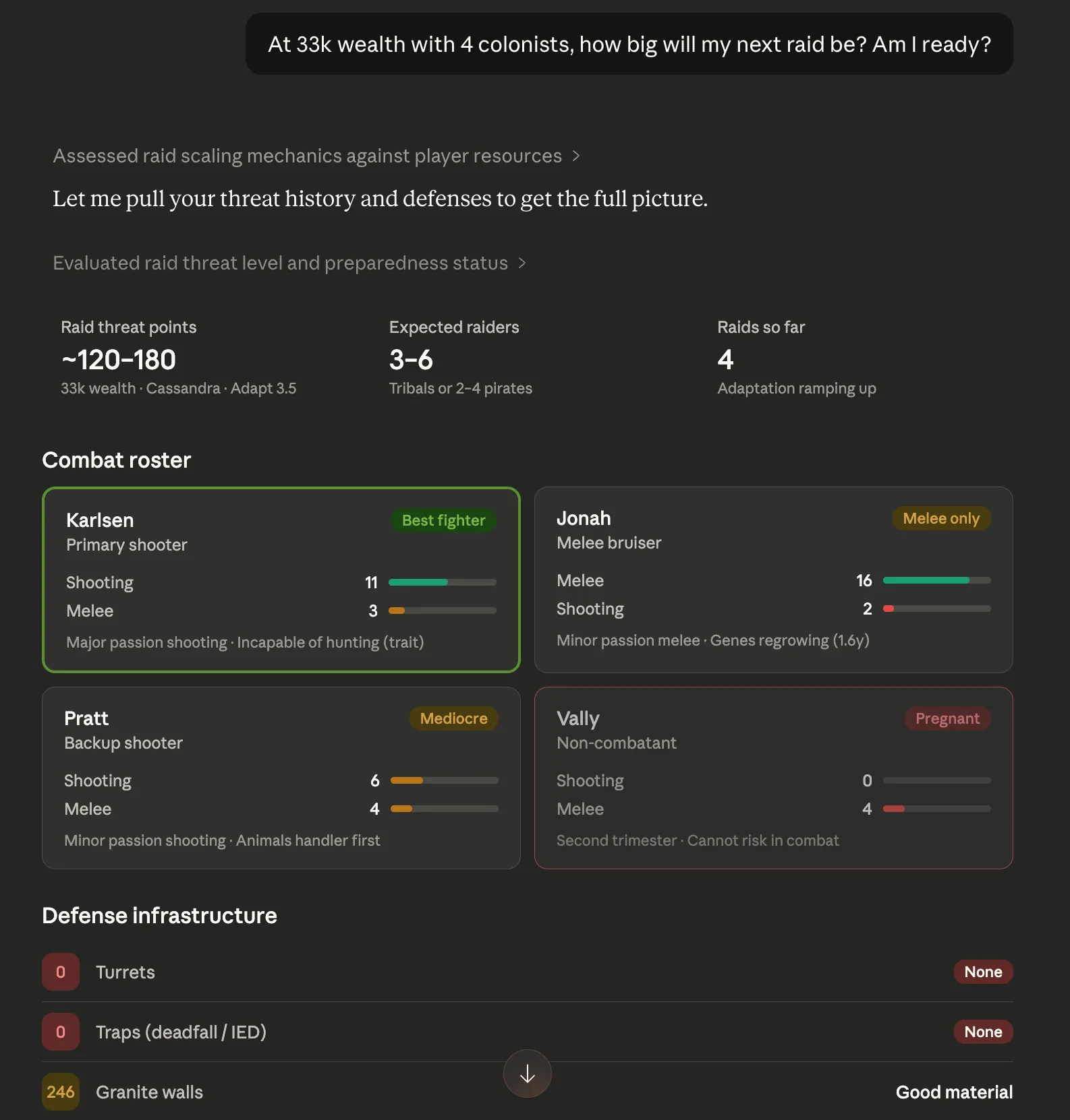 Savecraft connects your colony to Claude and ChatGPT. Colonists, mood, resources, research, defenses, rooms, factions, threats -- real data from your actual save, updated live.