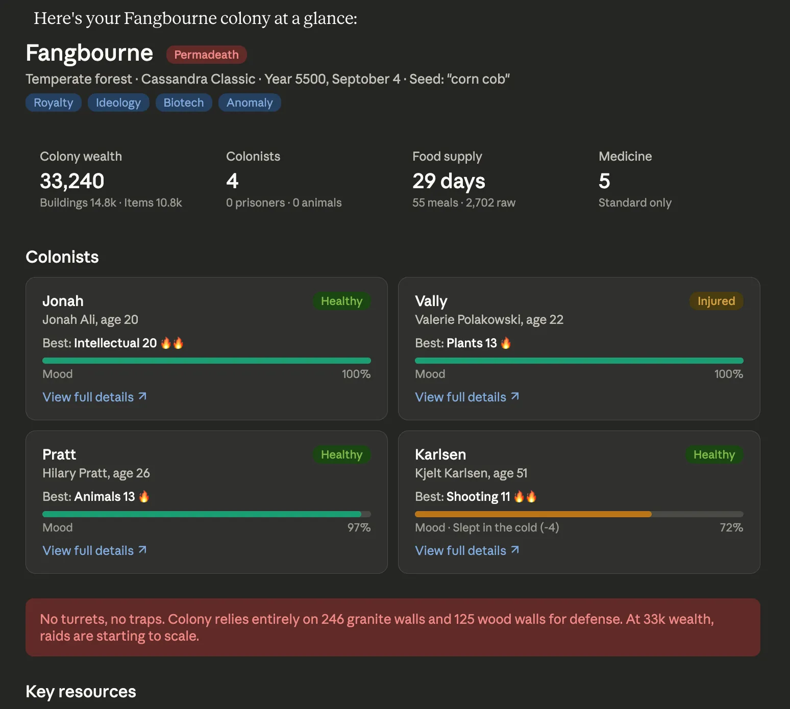 [*] Resources: full stockpile inventory, food supply in nutrition-days, medicine by type