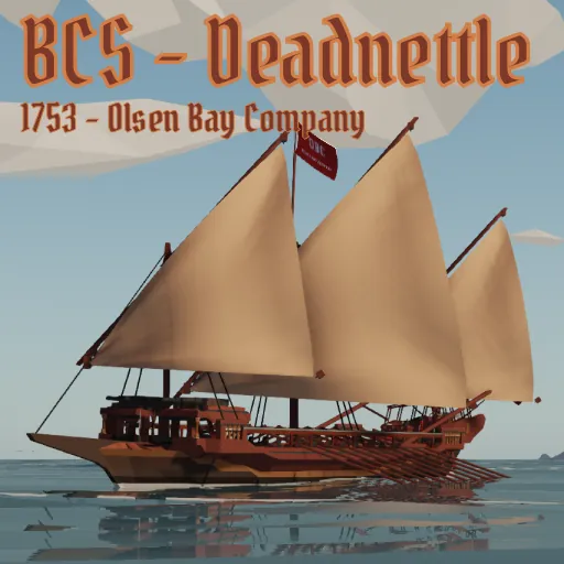 The BCS (Bay Company Ship) Deadnettle was the oldest actively serving vessel used during the war against the Kingdom of Donkk. The ship followed a centuries old design with its primary advantage being the ability to maneuver in shallow waters independently of winds and currents. In combat the Deadnettle proved to have sufficent capabilities but struggled further from shore. After the war she served as a training ship before being scrapped.
