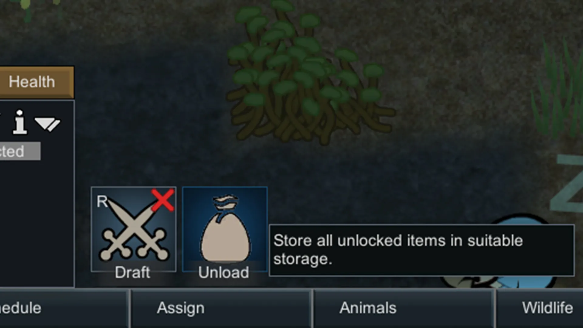 Selected colonists get an "Unload" command button. When clicked, the pawn will automatically go and distribute all unlocked items into appropriate stockpiles.