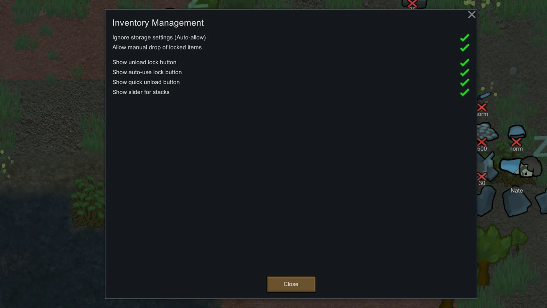 [] Ignore Stockpile Settings: Automatically add items to filters when unloading.[] Stack Slider: Enable/disable the window for selecting the exact number of items during transfer.[] Button Visibility: You can hide the lock buttons or the quick unload button if you don't use them.[] Manual Drop: Allow or disallow dropping "locked" items manually.