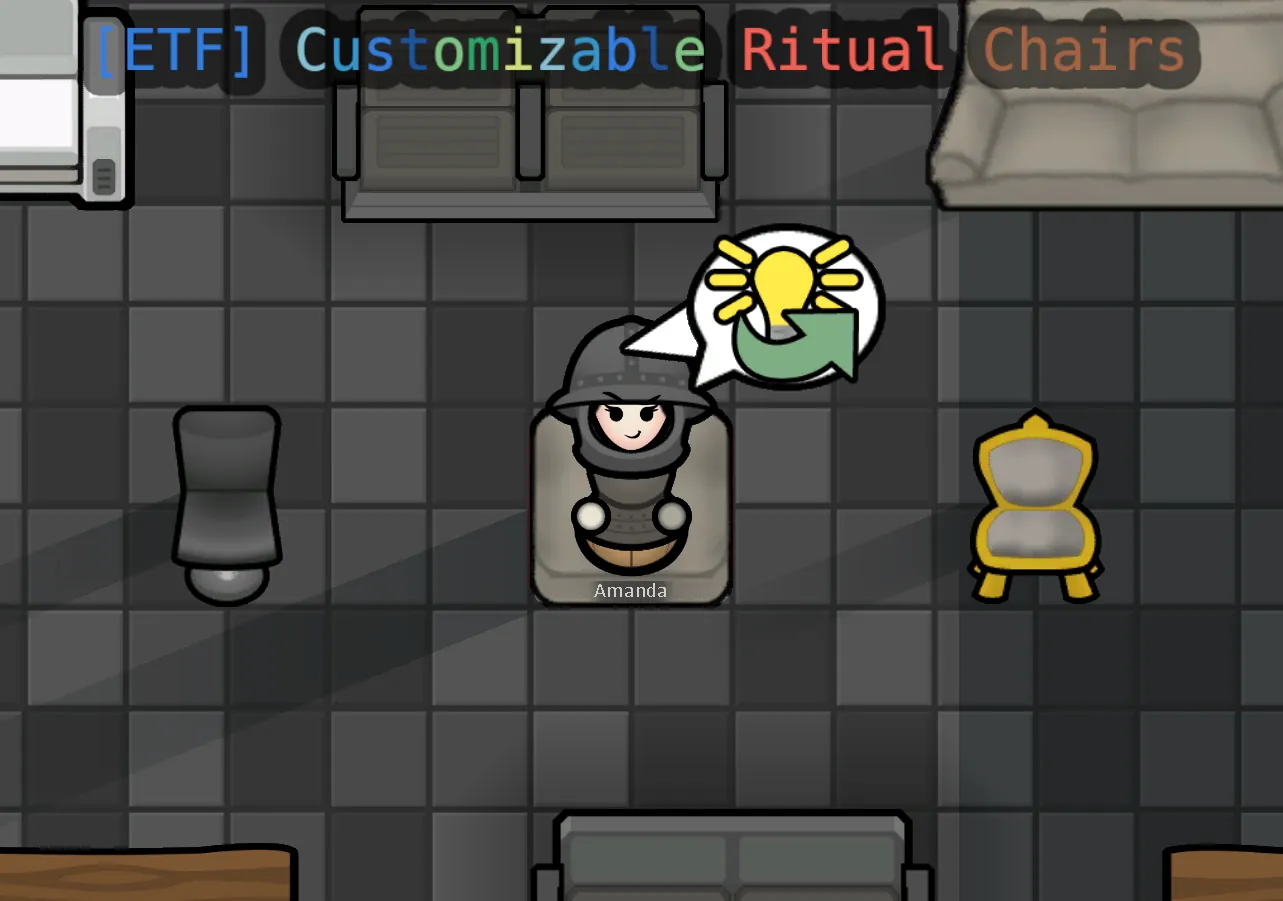 [b][ETF] Customizable Ritual Chairs[/b] fixes that flaw, letting you transform nearly any chair in RimWorld into a valid ritual seat and fully personalize your colony’s ceremonial setup.