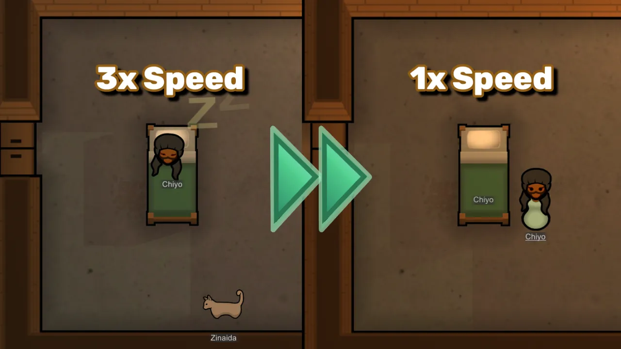 [*] [b]Change speed[/b] - You can configure what speed you would like the game set to when pawns sleep and when they wake up